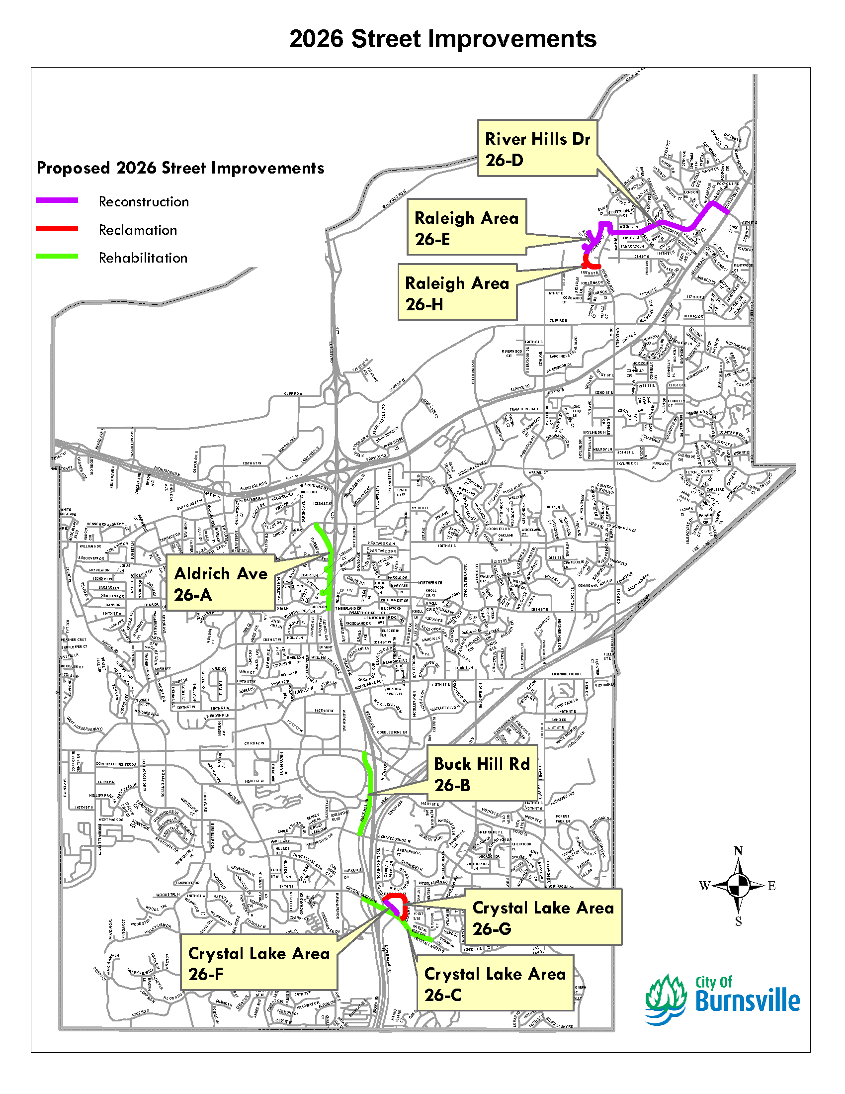 The City of Burnsville improves a select number of local streets each year. The selected streets are identified annually in the five-year Capital Improvement Plan (PDF). Improvements are prioritized based on factors such as age, street condition, utilities condition and the type of street.